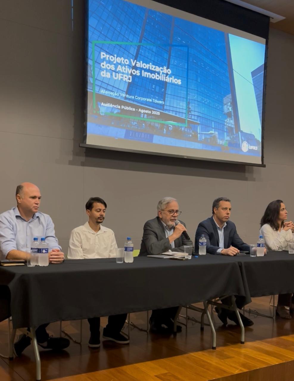 A Universidade Federal do Rio de Janeiro (UFRJ), por meio da Pró-Reitoria de Gestão e Governança (PR6), realizou audiência pública destinada a discutir a alienação de 11 unidades de sua propriedade no Edifício Ventura Corporate Towers, localizado no Centro do Rio de Janeiro. O encontro teve como objetivos dar publicidade às condições relevantes do processo, apresentar as contrapartidas previstas em obras de infraestrutura acadêmica e colher contribuições da comunidade universitária para o aprimoramento do projeto.